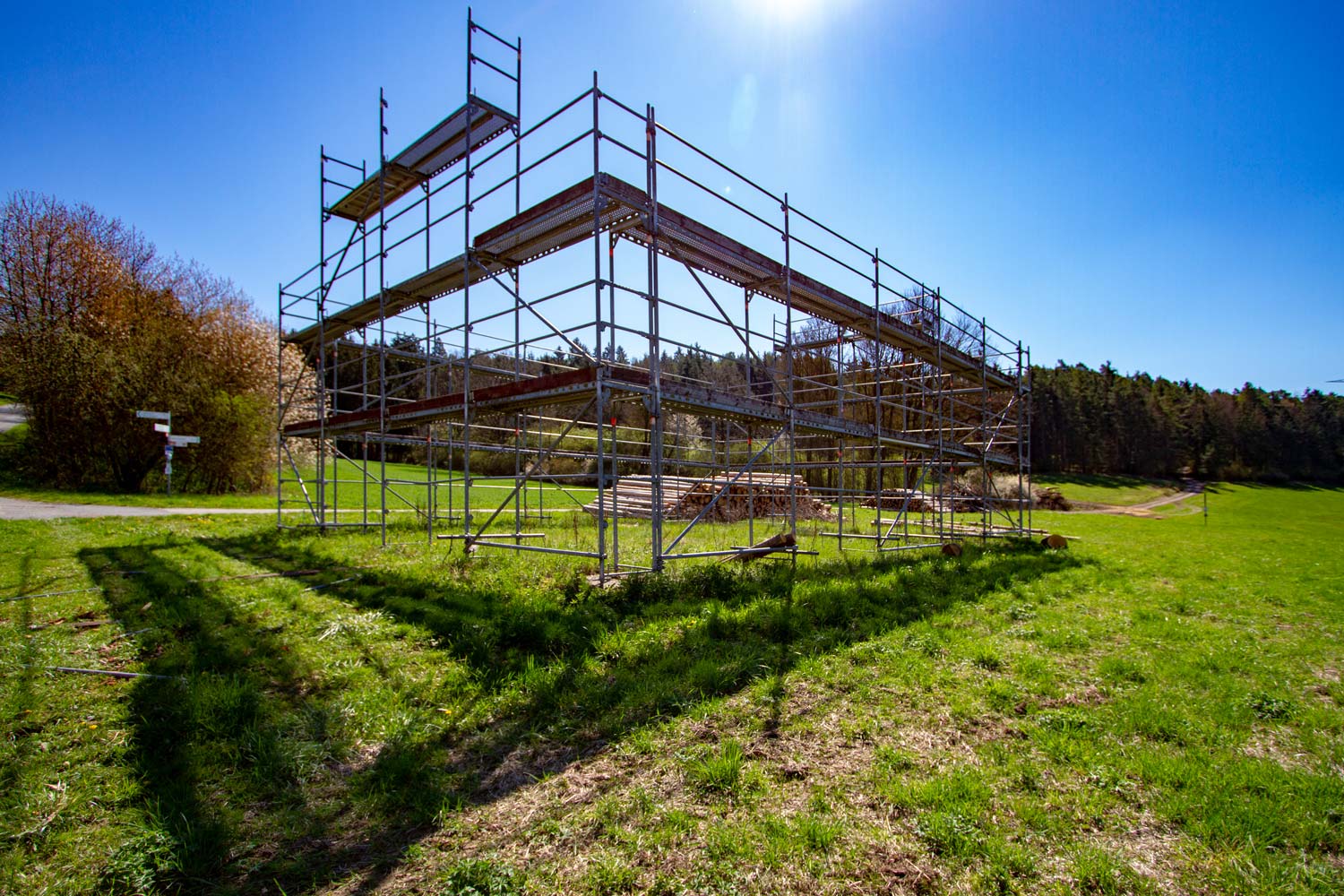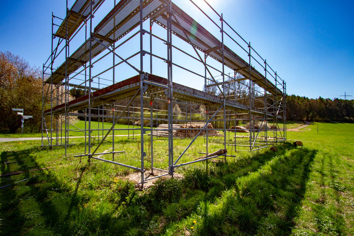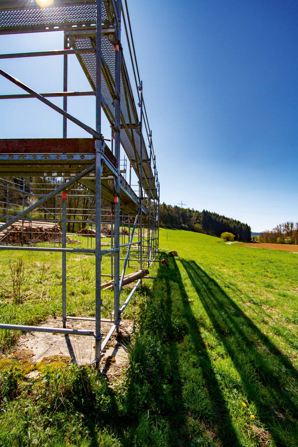 Es ist das Spiel mit Präsenz und Absenz: Die Verpackung ist vorhanden, aber der Inhalt fehlt. Der Künstler selbst assoziiert mit der Form des Gerüsts auch eine einschiffige Basilika. Lichtdurchflutet und nach allen Seiten offen erkennt er jenes hallenartige Gebäude aus altrömischer Zeit, das ursprünglich für Gerichts- oder Marktzwecke bestimmt war. Das Gerüst mitten in der Natur mag dem einen oder anderen Betrachter auch ein Unbehagen entlocken: er wird vielleicht an die Bebauung denken, die immer auch mit Zerstörung einhergeht.