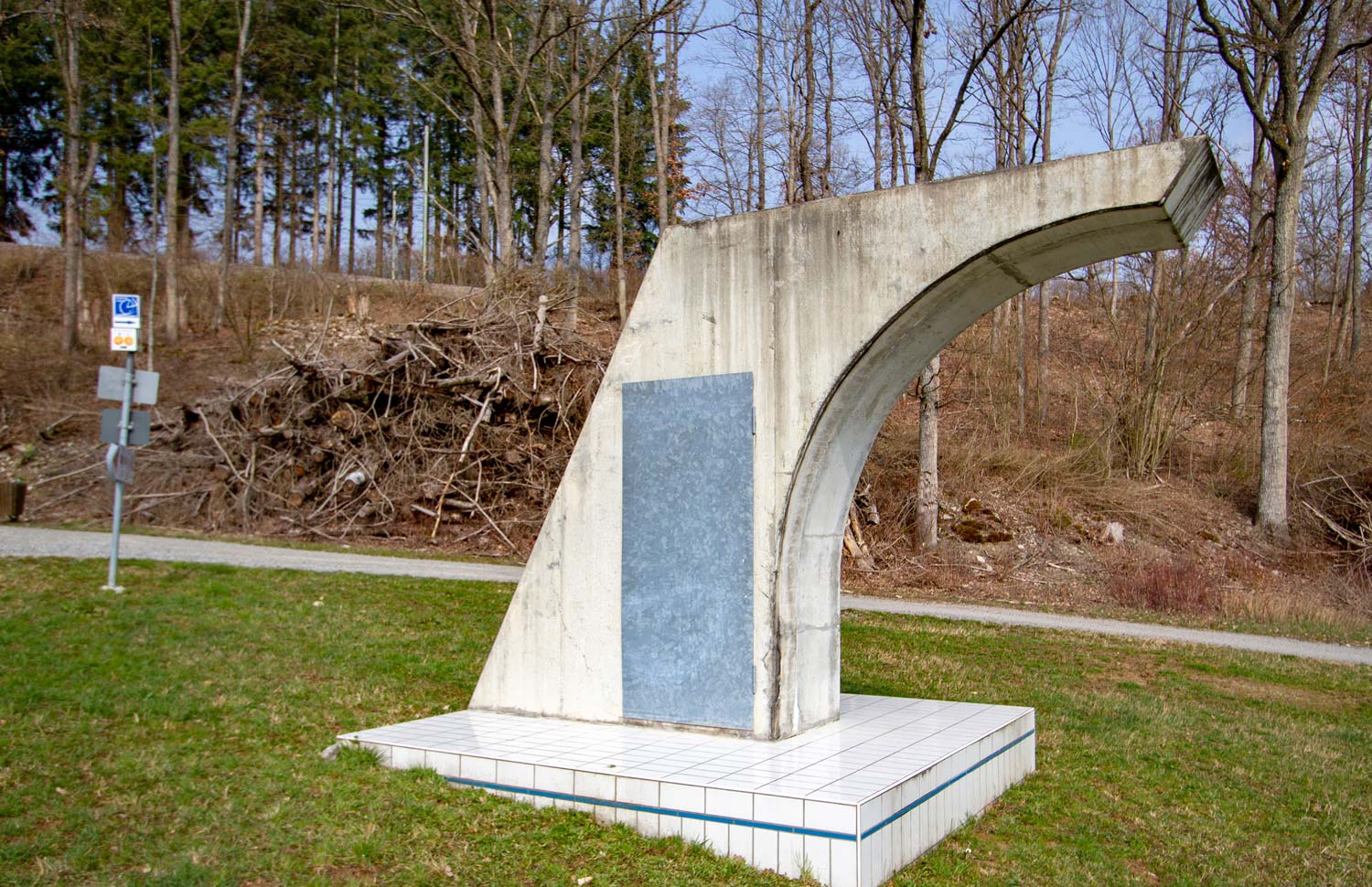 Wie das Fragment eines Aquädukts mit angedeutetem Innenbogen erhebt sich der Turm über die Rasenfläche. Der Sprungturm ist Hinweis auf etwas, das fehlt - das gesellige Umfeld eines Schwimmbads kann lediglich imaginiert werden. Die Vorstellung eines Sprunges in die Tiefe geht einher mit Unbehagen.