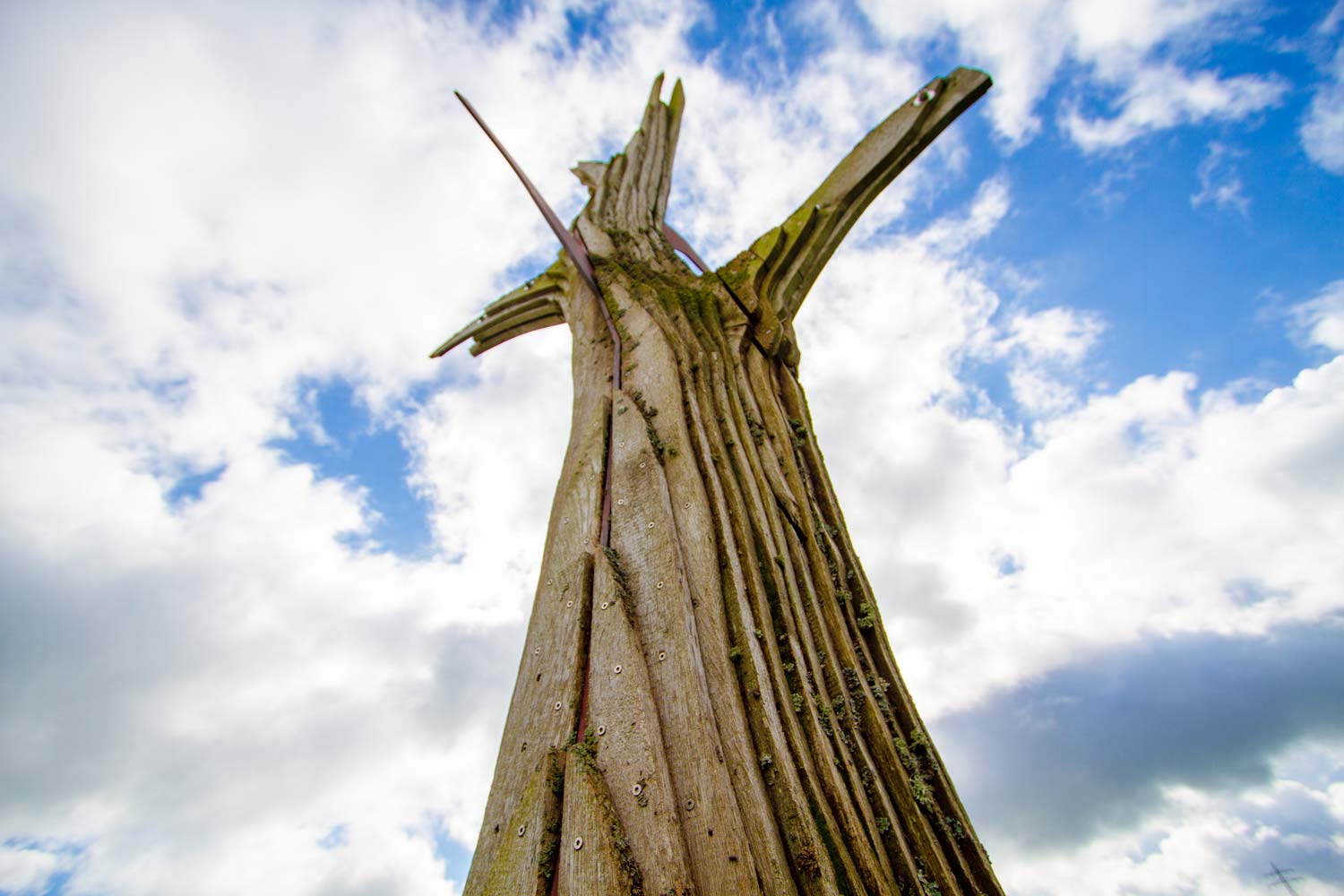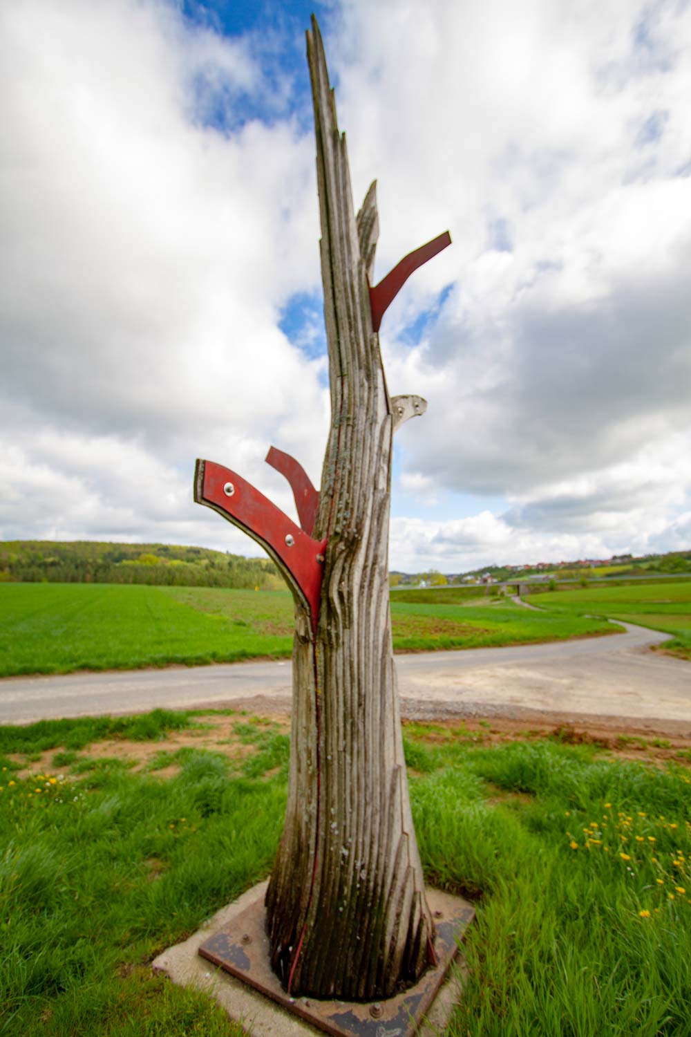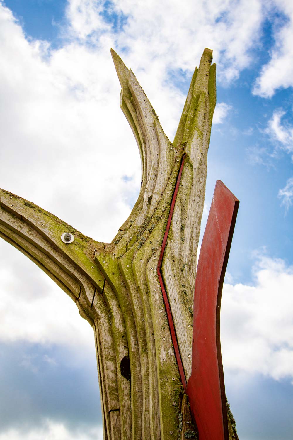 Eine gefällte Eiche aus der unmittelbaren Umgebung wurde in Bretter zerlegt, einem Stahlkern angepasst und anschließend wieder zu einem Ganzen zusammengesetzt.
