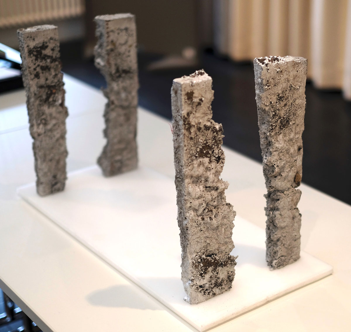 Nino Maaskola fertigte für „Sculpture for the road“ zwei großformatige Aluminiumgüsse. Diese 1,8 m hohen Aluminiumplatten werden zerbrochen, um vier großformatige Stelen entstehen zu lassen.