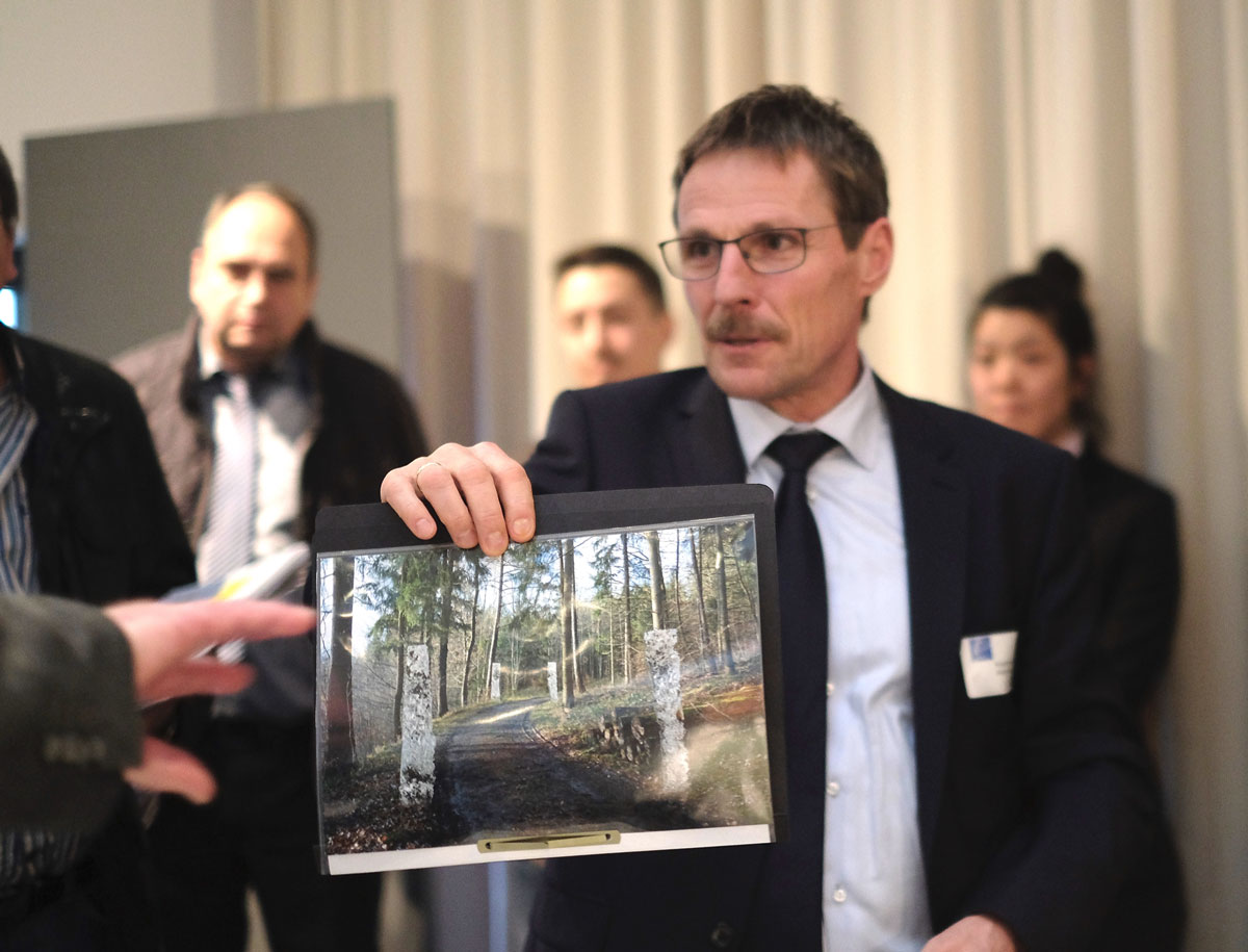 Die gebrochenen Aluminium-Stelen werden mit Stiften zur Halterung im Boden versehen. Die Oberflächenstruktur der Abgüsse findet sich in der Unregelmäßigkeit des Blattwerks des Waldes wieder; die Aluminiumgüsse gehen durch ihre Struktur und Farbigkeit in der Baumlandschaft auf, verschmelzen mit ihr.